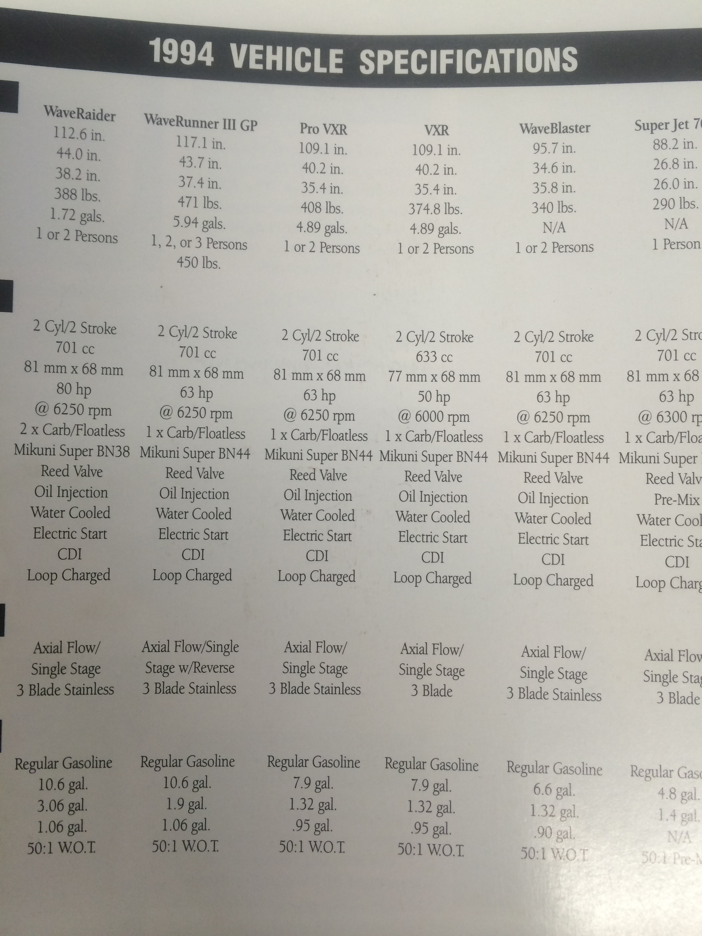 I have for a sale a 1994 Yamaha Waverunner Pro VXR. 701cc/63hp, Mikuni Super BN44 Carbs. All Stock! This is a one owner machine. Brought brand new on 2/21/94 for $6464.00 in Louisville, KY. I have all original paper work including the original Bill of Sale, owners manual , practice and riding tips manual, Original Sales Brochure with Specs, and original titles for ski and trailer from 1994. Includes 1994 Hustler Single Axel Trailer. This is a super well maintained 20 year old machine. Always garage kept. Never left on the water. Never in Salt water. Fresh Water only. Always used Yama-lube TWC3 Oil. Several years back it started running a little rich and rather than replace the oil pump, it was removed, so now running premix. Still have the oil pump and it can be added right back on if that is your preference. New Spark Plugs this season and new battery 2 years ago. Always kept on tender when not in use. Seadoo's are cool, but if you want reliability and no problems the Yamaha is the clear choice. First solid CASH offer can trailer it home.